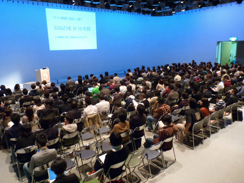 セミナータイトルは「なぜあなたのサイトに人が来ないのか? 集客力を飛躍的に向上させるGIGAZINE10年間のノウハウをついに初公開!」というもので、GIGAZINEの中の人が10年間サイト運営を続けてきた中で得たサイト集客のポイントを話すというもの。